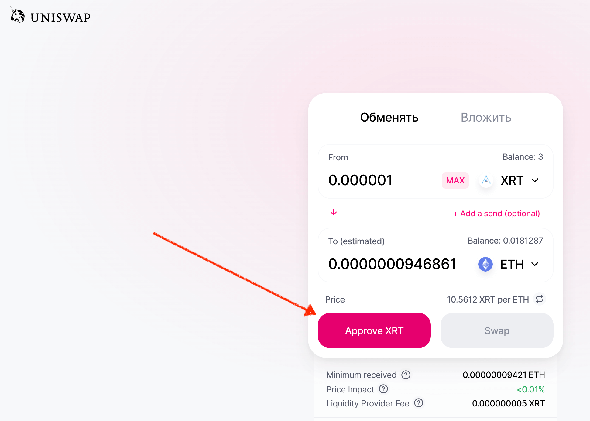 Новичкам на Uniswap нужно знать, что перед обменом купленных токенов на ETH обратную пару нужно подтвердить или аппрувнуть. Делается это путём проведения транзакции. Здесь указывайте крошечную сумму в токенах и высокую комиссию.