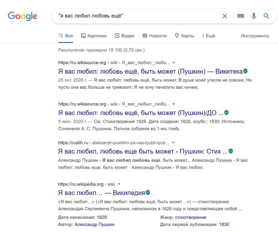 Если вы точно знаете, что ищете, используйте “ ” (кавычки). В выдаче будут показываться только сайты, содержащие слова в том порядке и в той форме, как вы указали в запросе. Так удобнее всего искать стихи и цитаты.