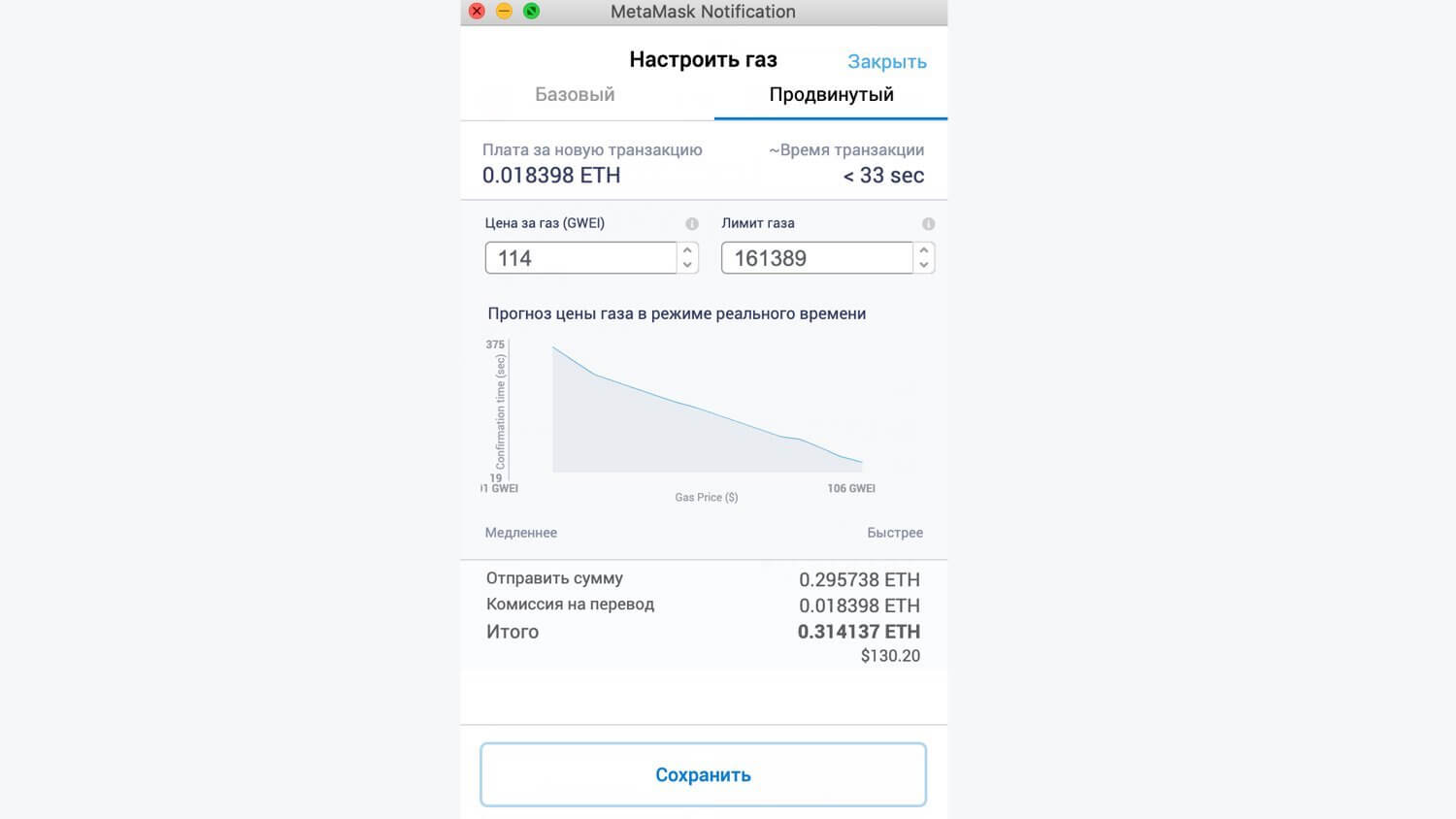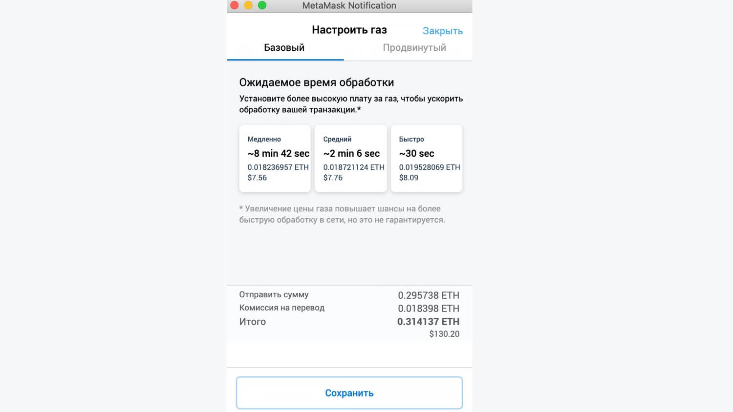 Стоимость газа указывается перед подтверждением транзакции. Для этого можно установить ожидаемое время обработки транзакции на “медленно”, “средне” и “быстро”.