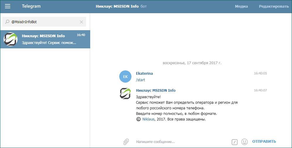 @MsisdnInfoBot – данные о номере телефона. В нем содержится информация о стране и регионе его владельца. Эта особенность носит название “телефонный план нумерации”. Используя три цифры после 8 или +7, он выясняет, на какой территории России зарегистрирован абонент.
