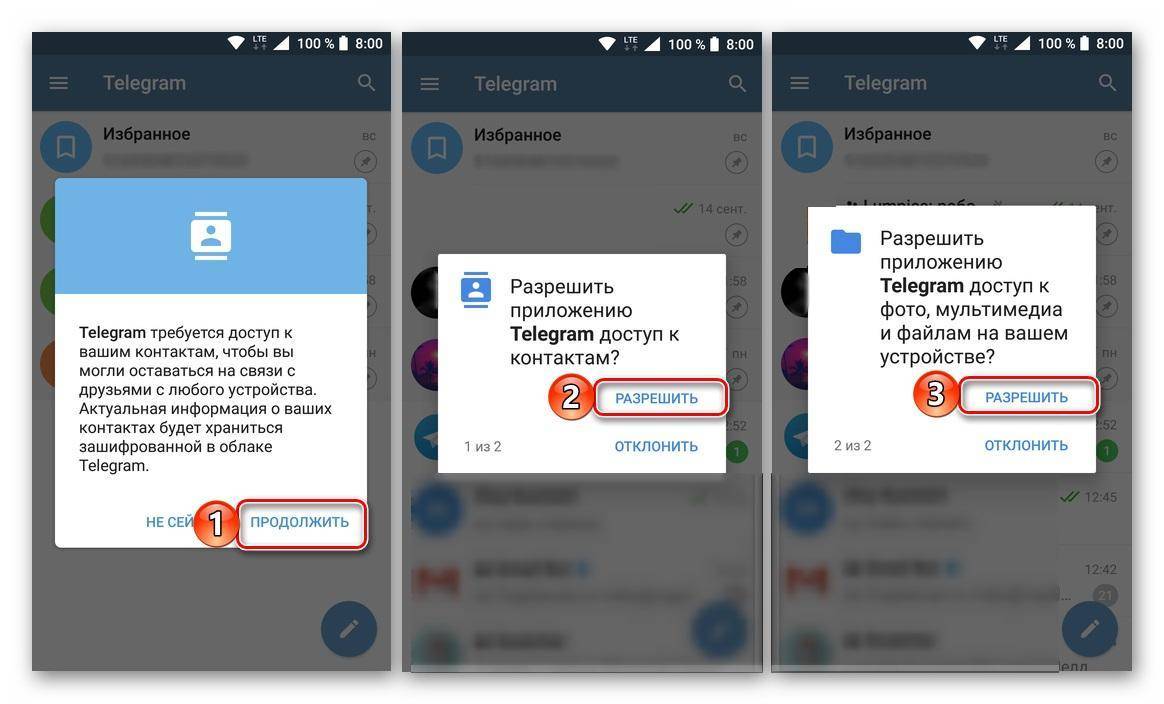 Далее Телеграм предложит настроить синхронизацию с контактами, которые хранятся в вашей телефонной книге. Для этого необходимо выдать разрешение, еще одно разрешение запрашивает доступ к файлам, чтобы пользователь мог обмениваться информацией.