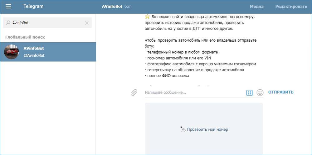 - далее отправьте боту имеющуюся у вас информацию: телефонный или государственный номер машины или ее VIN; фотографию транспортного средства, где хорошо видны номера; ссылку на объявление о продаже; полностью фамилию, имя и отчество человека;