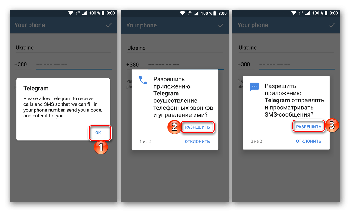 После скачивания Телеграм из магазина приложений или после установки через сторонние источники, можно начать использование программы. После запуска Telegram попросит выбрать язык и выдать 2 разрешения: доступ к СМС и звонкам. Смело соглашаемся и продолжаем.