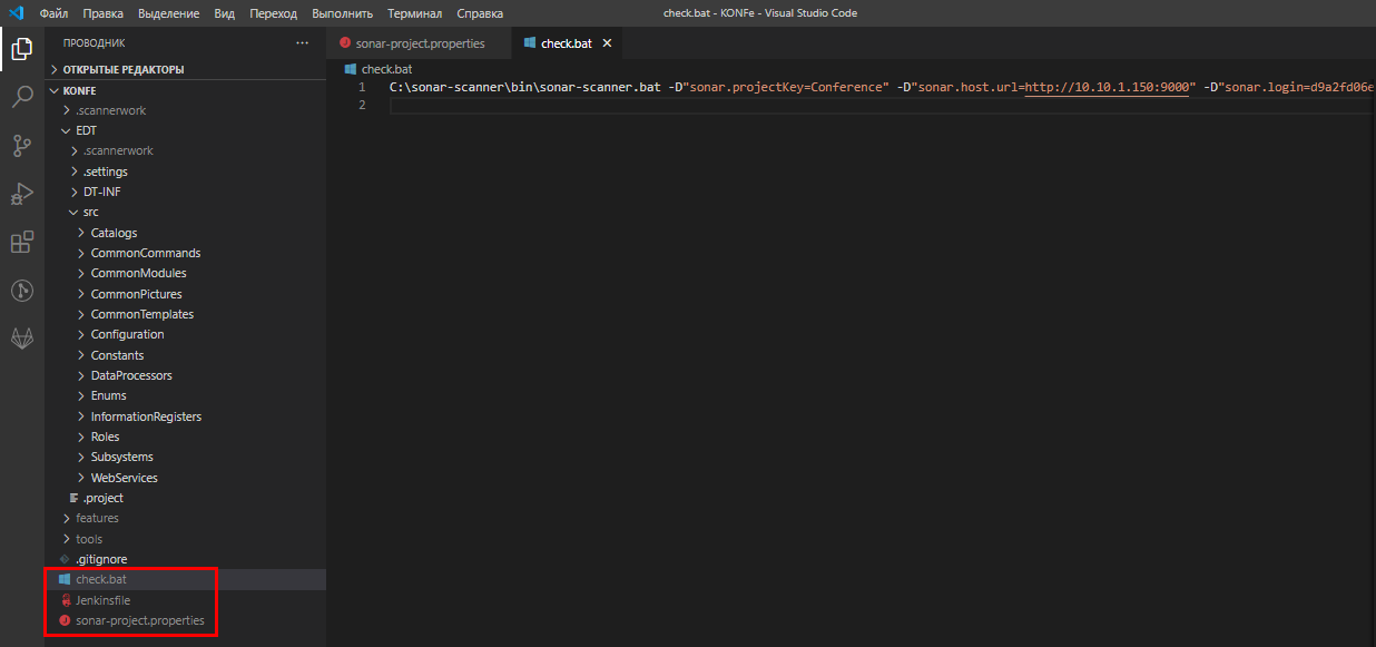 Мы у себя в батнике check.bat, который лежит в корне нашего проекта, оставили только токен и ключ проекта, а остальные параметры вынесли в sonar-project.properties.
