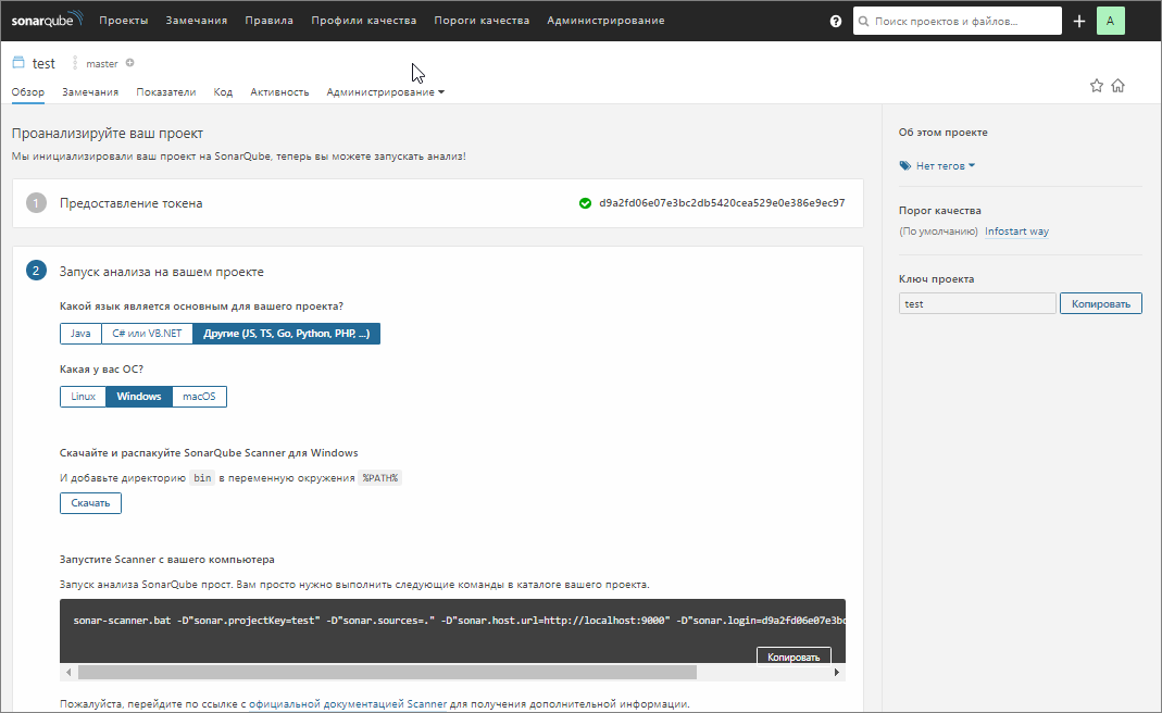 Пример команды для батника check.bat вы можете получить из самого SonarQube, когда вы добавляете новый проект на закладке Проекты.