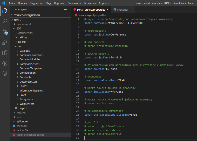Чтобы просканировать проект вручную, надо положить в папку с исходниками батник check.bat и, опционально, еще файл sonar-project.properties.