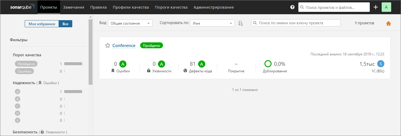 Теперь если мы вернемся в SonarQube, у нас порог качества у проекта Conference поменялся на «Пройдено» и обновилась дата последнего анализа.