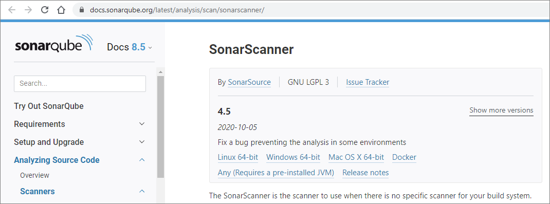 Вы можете просто ввести в поисковике sonar-scanner, и первая же ссылка https://docs.sonarqube.org/latest/analysis/scan/sonarscanner/ ведет на сайт SonarQube. Здесь у нас есть возможность скачать sonar-scanner для различных операционных систем. Мы скачиваем sonar-scanner для Windows.