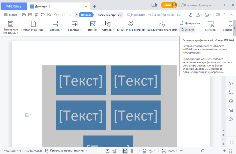 На вкладке «Вставка» доступны функции для добавления различных элементов в документ: таблиц, рисунков, диаграмм, графических объектов WPSArt. Также через нее можно работать с колонтитулами и нумерацией страниц. Чтобы создать оглавление документа, потребуется перейти на вкладку «Ссылки». Здесь же предусмотрены опции для создания сносок и подписей.