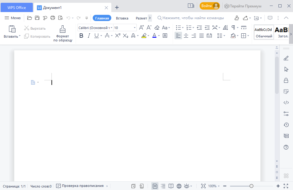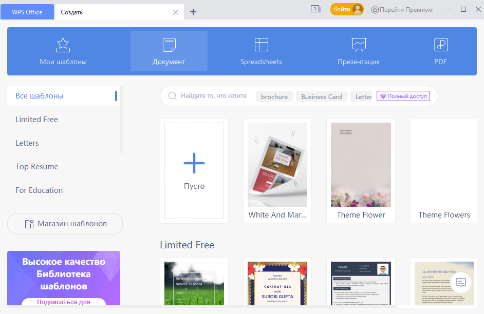 Пакет WPS Office позволяет работать с текстовыми документами, предоставляя полный функционал, аналогичный известному редактору от Microsoft. При нажатии на иконку WPS Writer в главном окне откроется дополнительная вкладка с готовыми шаблонами текстовых документов. Чтобы создать новый документ, щелкните по пустому файлу, отмеченному знаком «+».