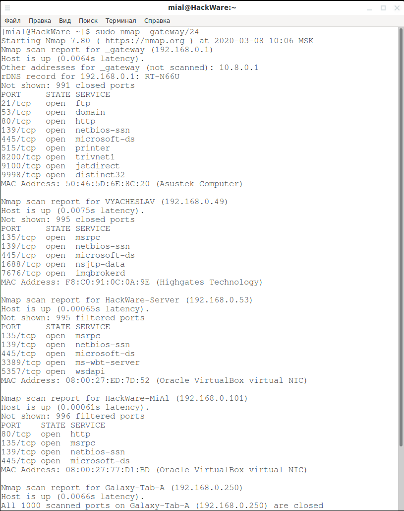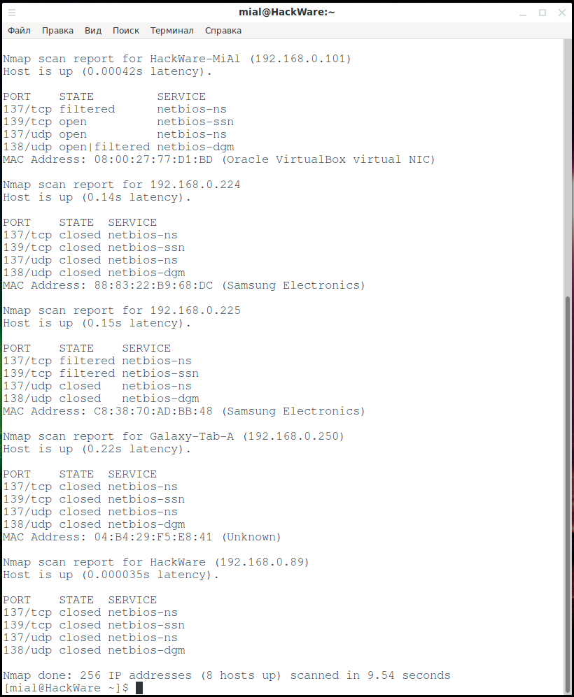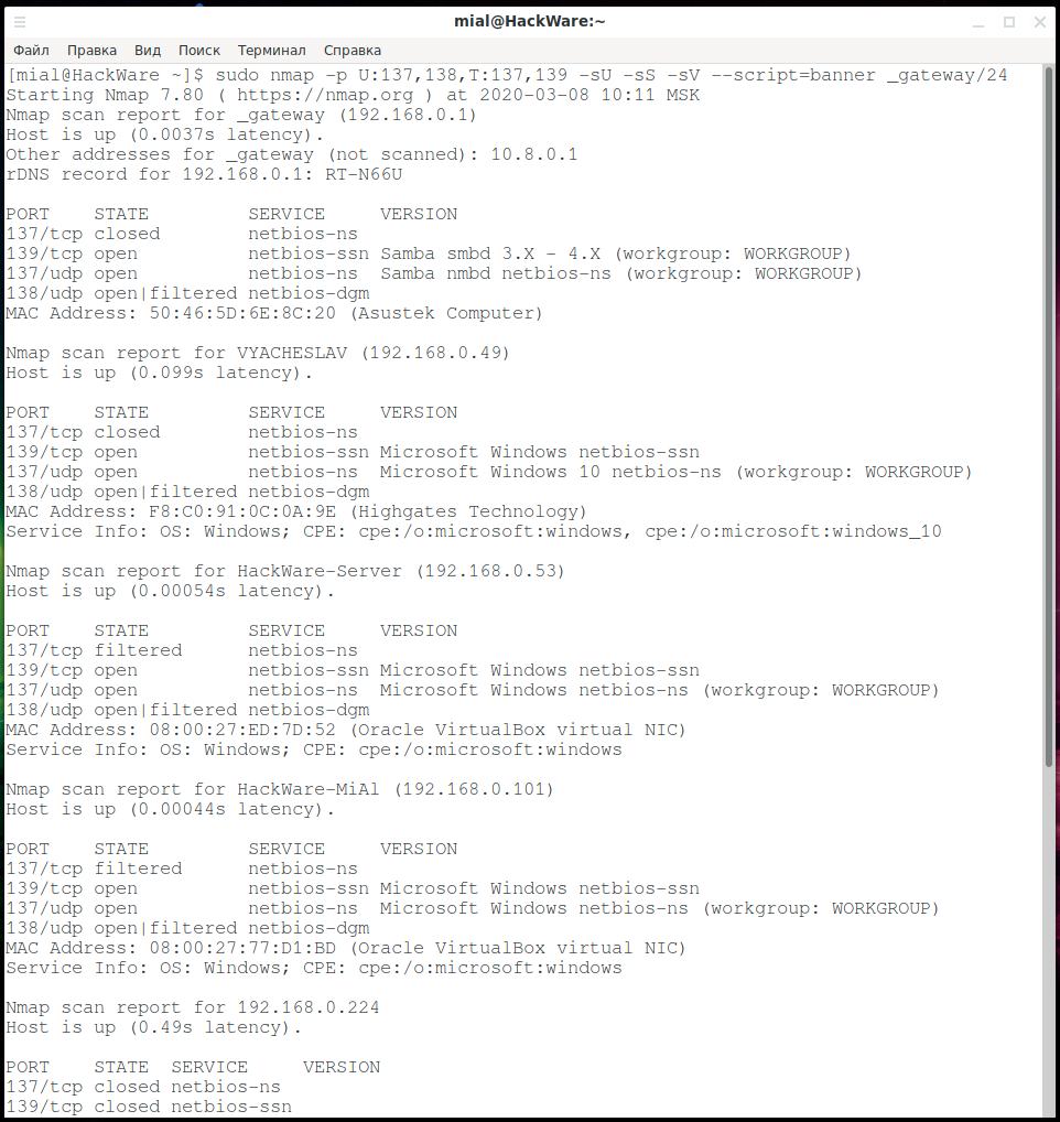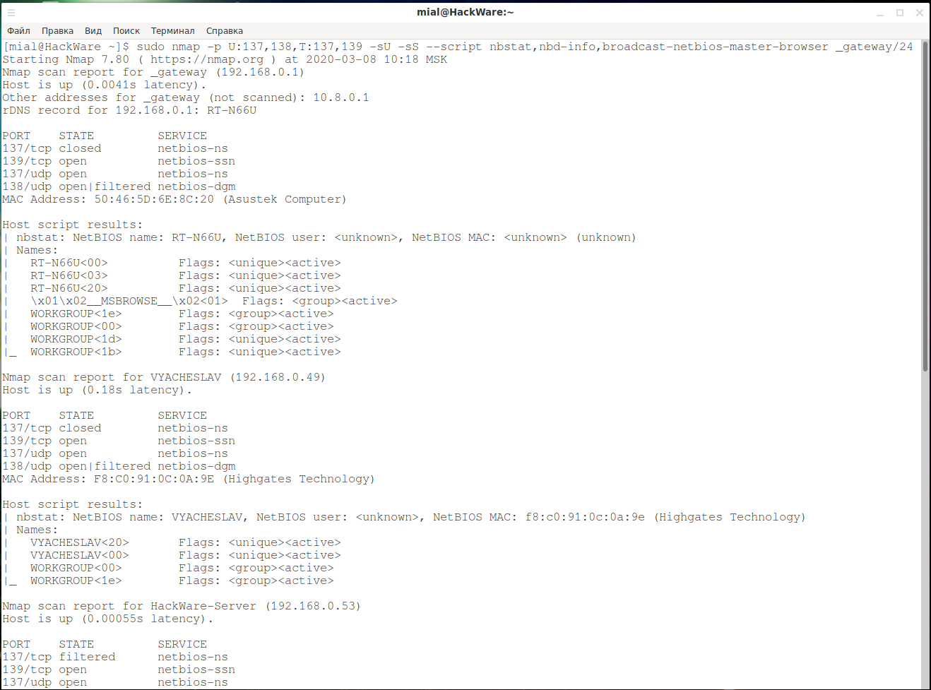 Для вывода имён, определённых с помощью рассылки и WINS запустите такую команду: