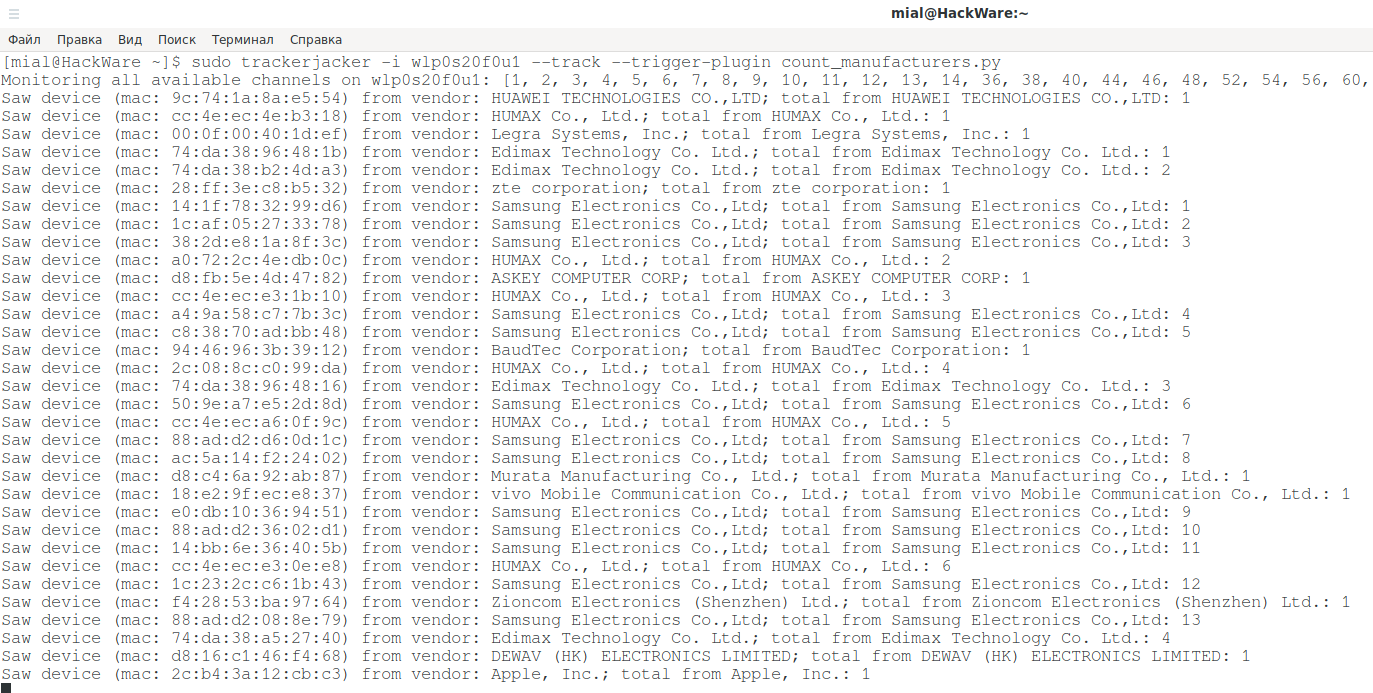 sudo trackerjacker --track --plugin plugin_examples/monitor_device_list.py --plugin-config "{'device_list': 'deepsec_devices.txt'}"В этом файле (deepsec_devices.txt) список должен иметь один MAC адрес на одну строку.