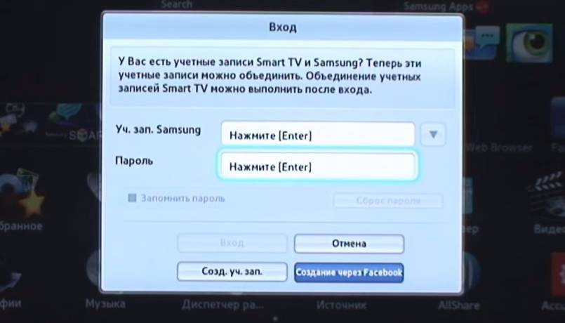 Также Самсунг предлагает возможность авторизоваться через FaceBook. Вам не придется создавать дополнительный аккаунт. Достаточно ввести логин и пароль из социальной сети, после чего УЗ синхронизируется с телевизором. Таким образом, вы получите доступ ко всем функциям Samsung с поддержкой Smart TV.