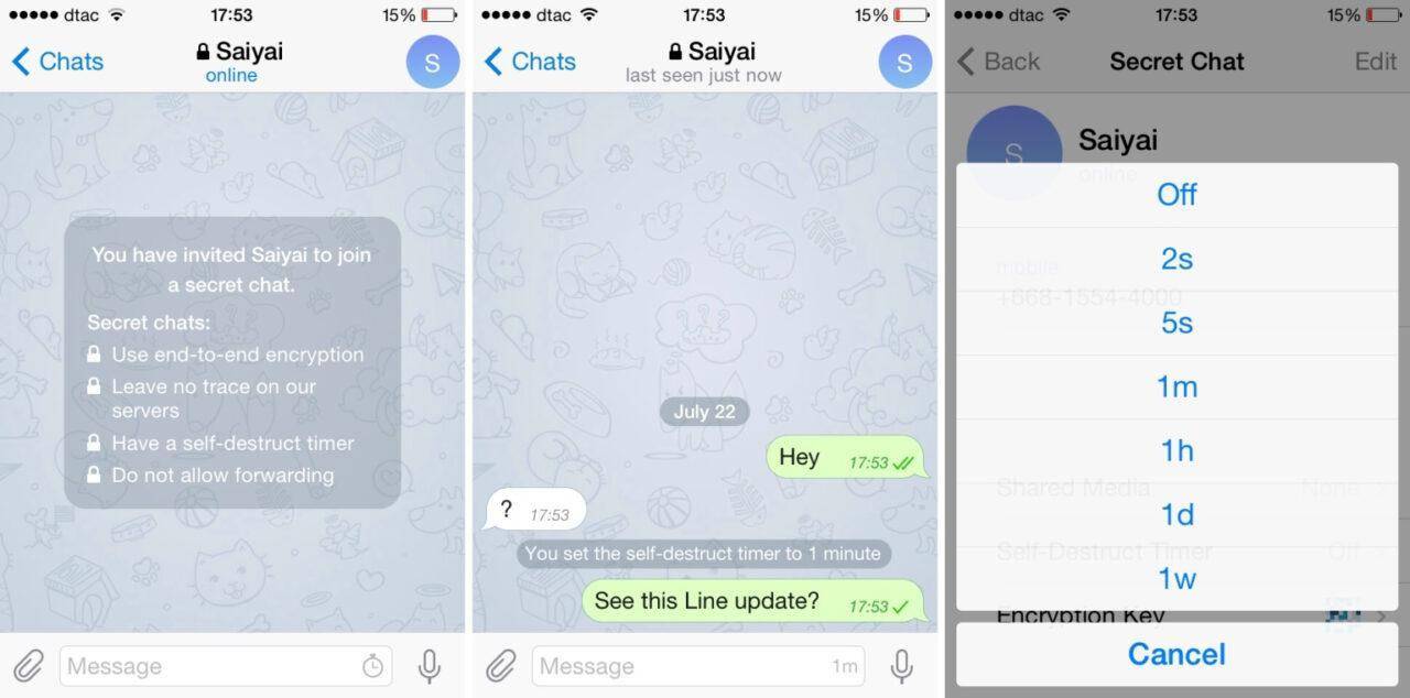 Для тайной переписки можно создать секретный чат. Вся переписка будет располагаться в памяти устройств только самих собеседников. Через самостоятельно настроенный пользователем интервал времени, все сведения о беседе сама беседа с приложенными файлами, например, текстовые документы, фото и видео, бесследно стираются.