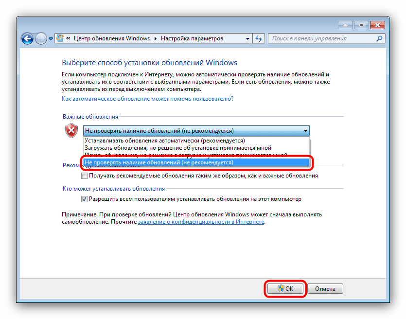- В новом окне из выпадающего списка «Важные обновления» выберите пункт «Не проверять наличие обновлений».