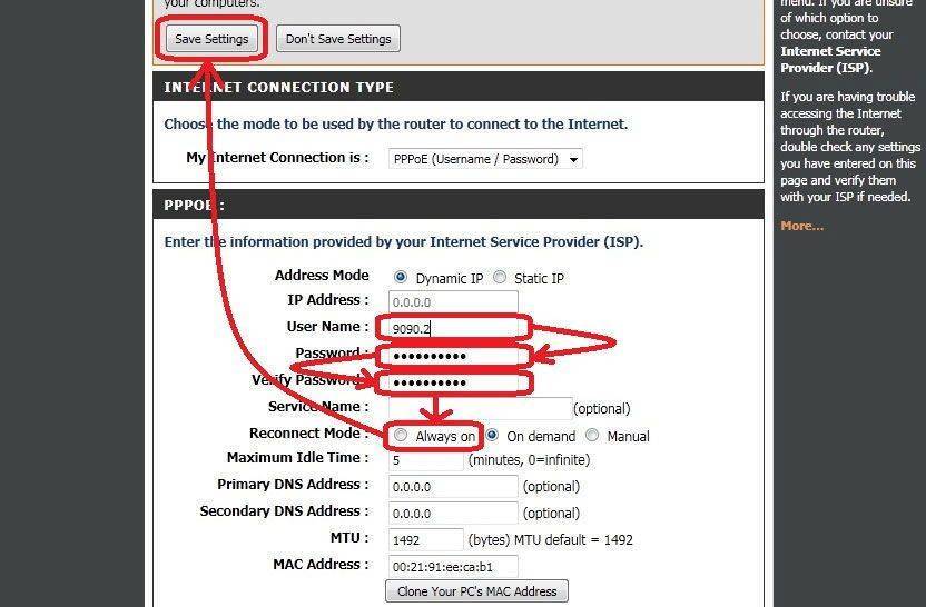 PPPoE. Динамичный PPPoE отличается от статичного только тем, что он сам указывает IP и DNS-адреса. В графах Имя пользователя и Пароль мы набираем те данные, что указаны в вашем договоре об оказании интернет-услуг. С MAC-адресом поступаем так: если провайдер требует — выбираем «Clone», если нет — пропускаем. Дальше вам будут даны на выбор 3 способа подключения: первый — подключаться автоматически, второй — вручную, третий — в том случае, когда есть обращение в сеть. Другие пункты не трогаем, изменения сохраняем.