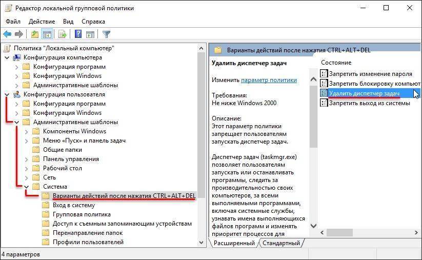 Таким действием открывается окно «Групповой политики». Из него нужно через «Конфигурацию пользователя» пройти в «Административные шаблоны», и через «Систему» к «ресурсам Ctrl+Alt+Del». Справа окна-диалога войти (по двойному клику) в характеристики «удаления»: