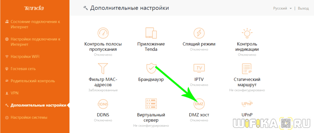 Активация DMZ хоста на wifi роутере Tenda находится в «Дополнительных настройках». Здесь все просто — переводим тумблер во включенное положение и вписываем IP адрес компьютера или иного устройства, на котором мы хотим открыть все порты