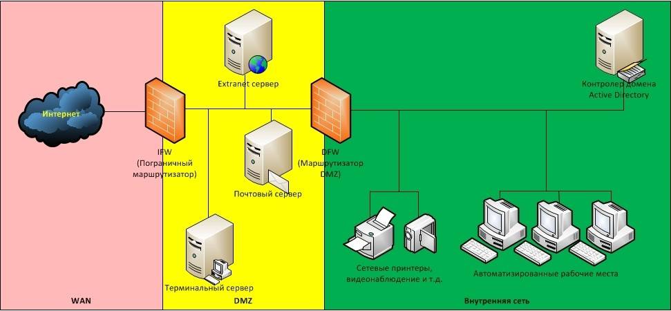 Обратим внимание на пунктирную линию, она показывает следующее: все что за демилитаризованной зоной, является милитаризованной зоной, защищаемой другим межсетевым экраном. Отдельный межсетевой экран важен по следующей причине: если из сети интернет , то вся сеть перестанет работать, он не сможет пропускать через себя трафик сегментов второго уровня