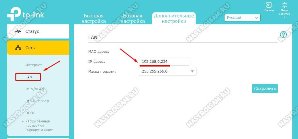- Зайдите в раздел «LAN» и смените IP-адрес в соответствующем поле. Например, на первом девайсе ИП будет «192.168.0.1», а на втором «192.168.0.2». Жмите «Сохранить» — оборудование автоматически перезагрузится.