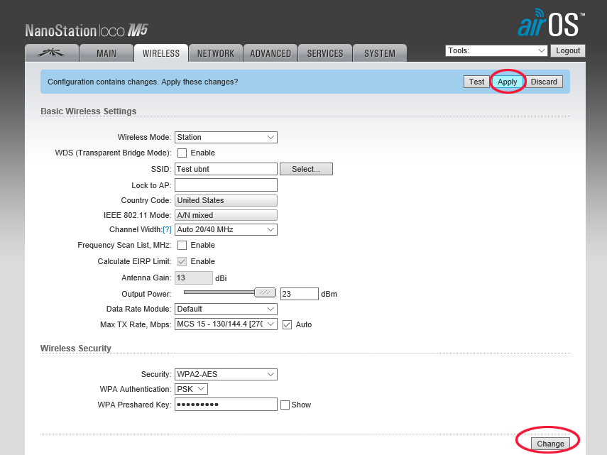 6) После ввода всех необходимых настроек внизу справа жмем на Change и Apply. Точка перезагружается с нашими настройками