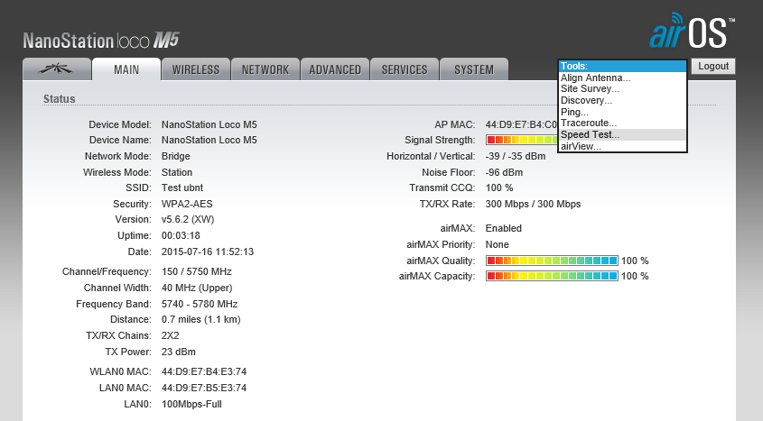 Настроим наше оборудование в режиме моста для тестирования скорости встроенной утилитой (Speed Test).