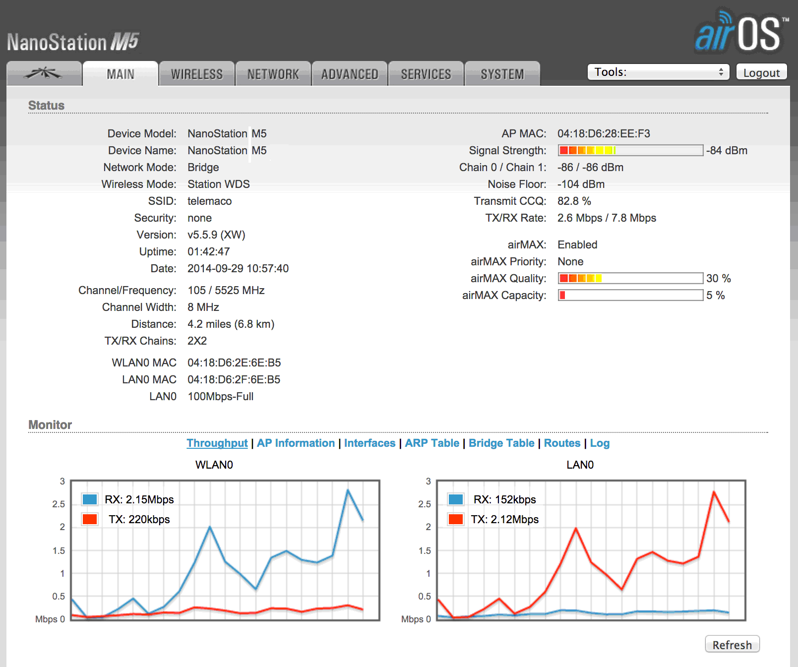 Аппарат построен на базе процессора Atheros MIPS 24KC с тактовой частотой 400 MHz. Имеет встроенную оперативную память RAM 32 МБ и 8 Мб флеш-памяти. Разъёмы LAN 100 Мб/с RG45. Рекомендуется прикупить грозозащиту, чтобы избежать выгорания порта и процессора, кроме того, повреждение от грозы не является гарантийным случаем. Ubiquiti Nanostation M5 работает в стандарте 802.11an по технологии airMAX. AirMAX можно выключить, тогда все устройства, которые работают на 150 Мб/с, смогут подключиться к точке. Мощность передатчика устройства — 23 dBm, это примерно 200 мВ. Рабочая частота — 5–5.9 GHz. Можно отметить двойную поляризацию: в горизонтальной поляризации угол раскрытия 45°, в вертикально — 45°. Чтобы зайти в панель управления точки доступа, нужно вбить IP в адрес браузера: 192.168.1.20. Логин: ubnt, пароль: ubnt. Ubiquiti Nanostation M5 отлично подходит для приёма и передачи сигнала Wi-Fi на дальние расстояния при температуре от -30° до +80° и влажности 95%. Применять её можно для построения соединения точка–точка или в качестве клиентского устройства CPE. Цена во многом зависит от гарантийных обязательств продавца.