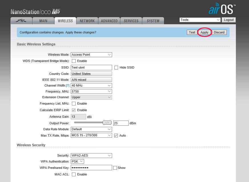 5) Зайдем во вкладку wireless и выполним настройки для базовой станции: Wireless mode ставим режим Access Point, SSID напишем (Test ubnt ), частоту мы поставили 5750 MHz , введем пароль для подключения точек (123456789).