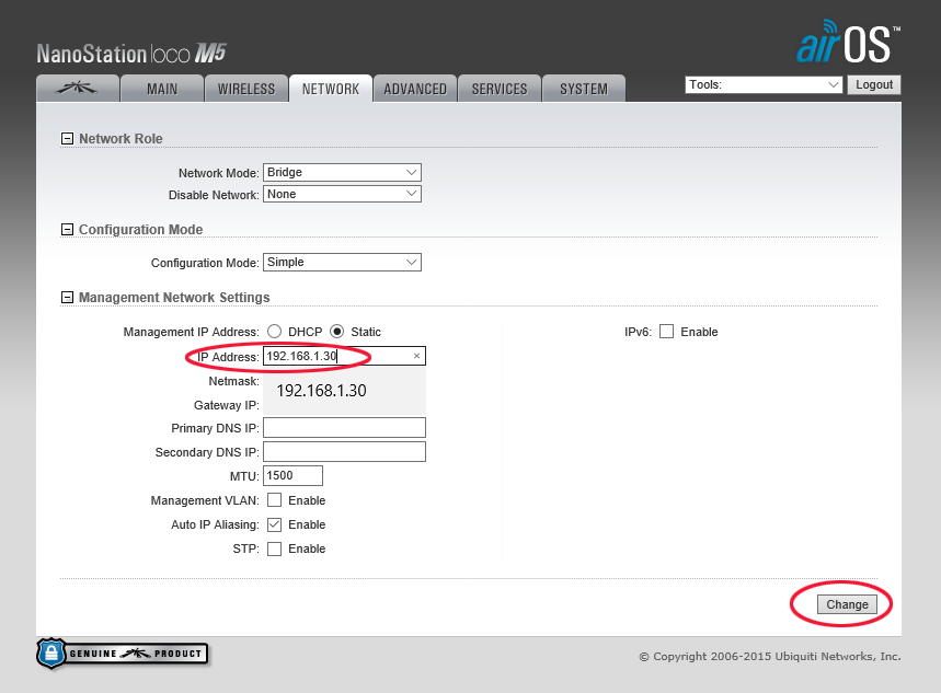7) После настройки Wireless перейдем во вкладку NETWORK, и поменяем стандартный ip на другой, для того что бы не произошел конфликт при подключении точек. Жмем на Change и Apply