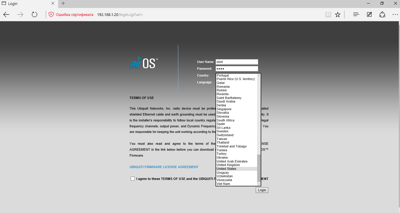 В полях «Username» и «Password» пишем ubnt, далее выбираем нужную вам страну. Жмем Login.