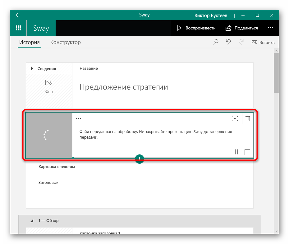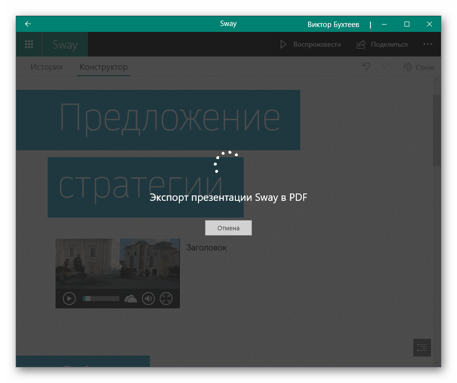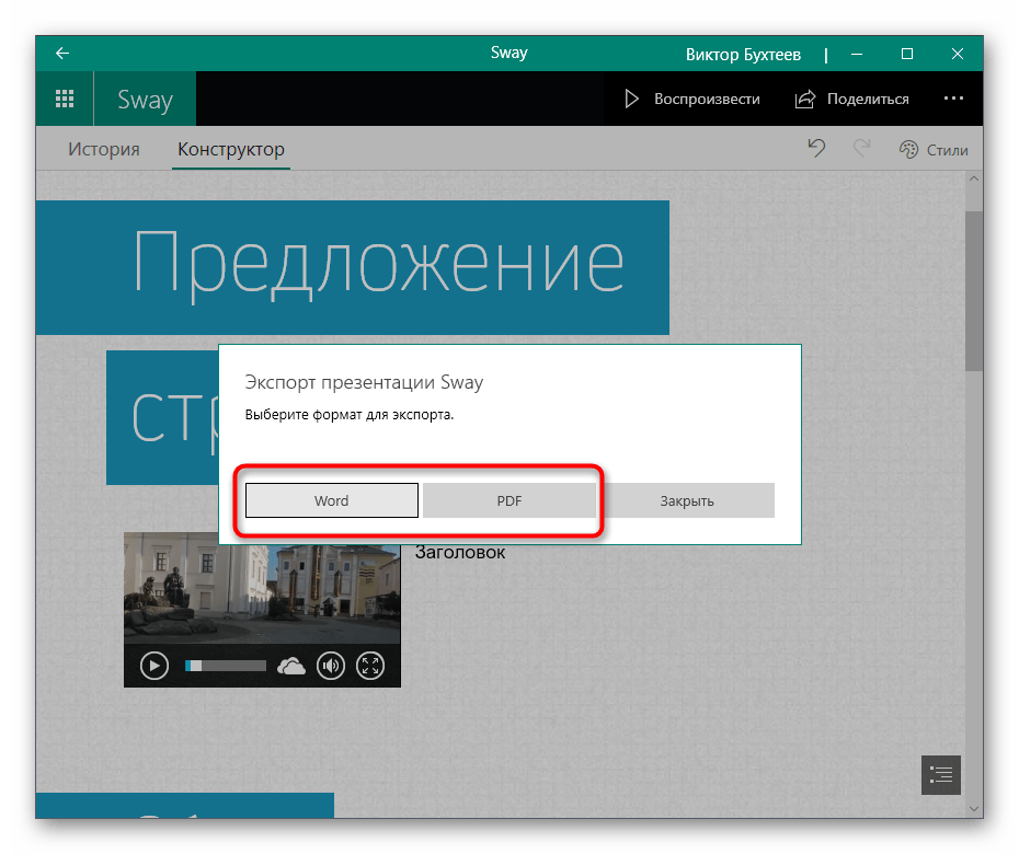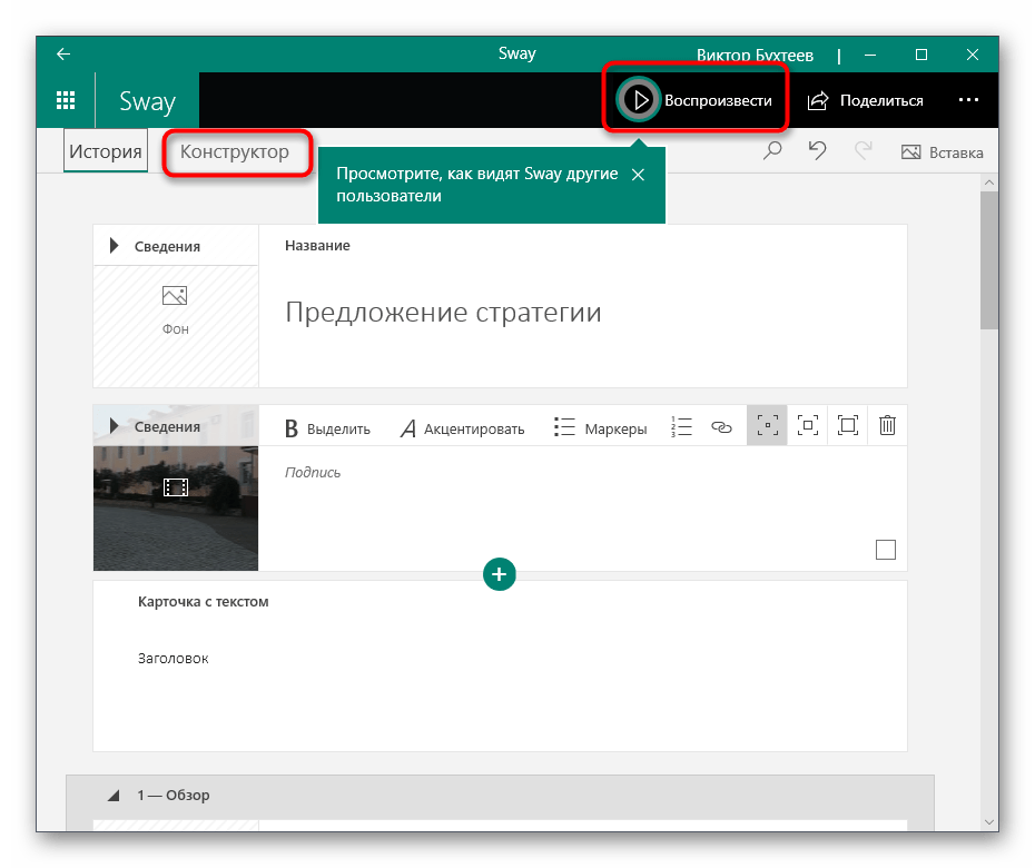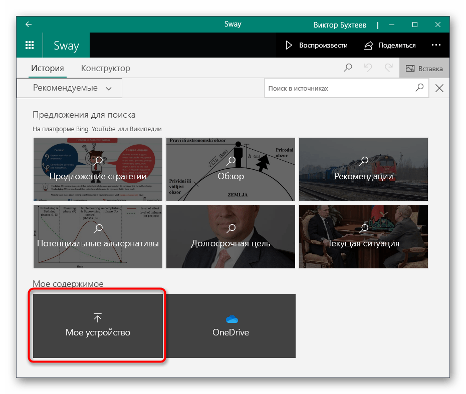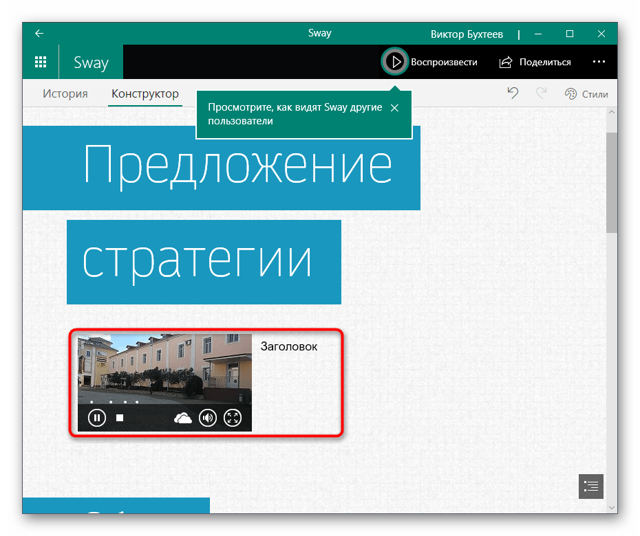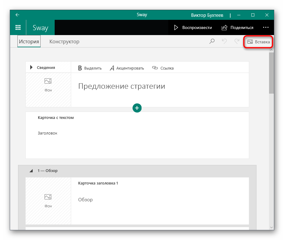 Sway — бесплатное программное обеспечение от компании Microsoft, предназначенное для быстрого оформления презентаций в формате DOCX или PDF. Следовательно, этот софт поддерживает открытие только презентаций в этих форматах и позволяет вставлять видео через соответствующий инструмент.