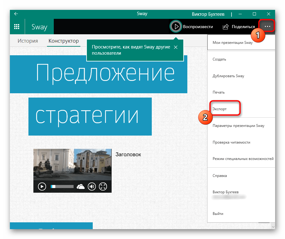 Откройте основное меню Sway, нажав по кнопке с тремя горизонтальными точками, и выберите пункт «Экспорт» для сохранения презентации.
