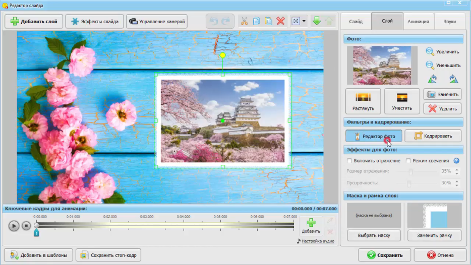 Зарубежная программа, позволяющая сделать мини фильм из фото и видео профессионального качества. С ее помощью можно объединять любые файлы, оформлять слайды на свой вкус, добавлять озвучку и накладывать спецэффекты. Для быстрого результата можно воспользоваться шаблонами – софт предлагает впечатляющее количество всевозможных заготовок. Функционал, как и у предыдущих программ, охватывает все необходимые инструменты – от многослойного редактирования слайда до анимирования объектов.