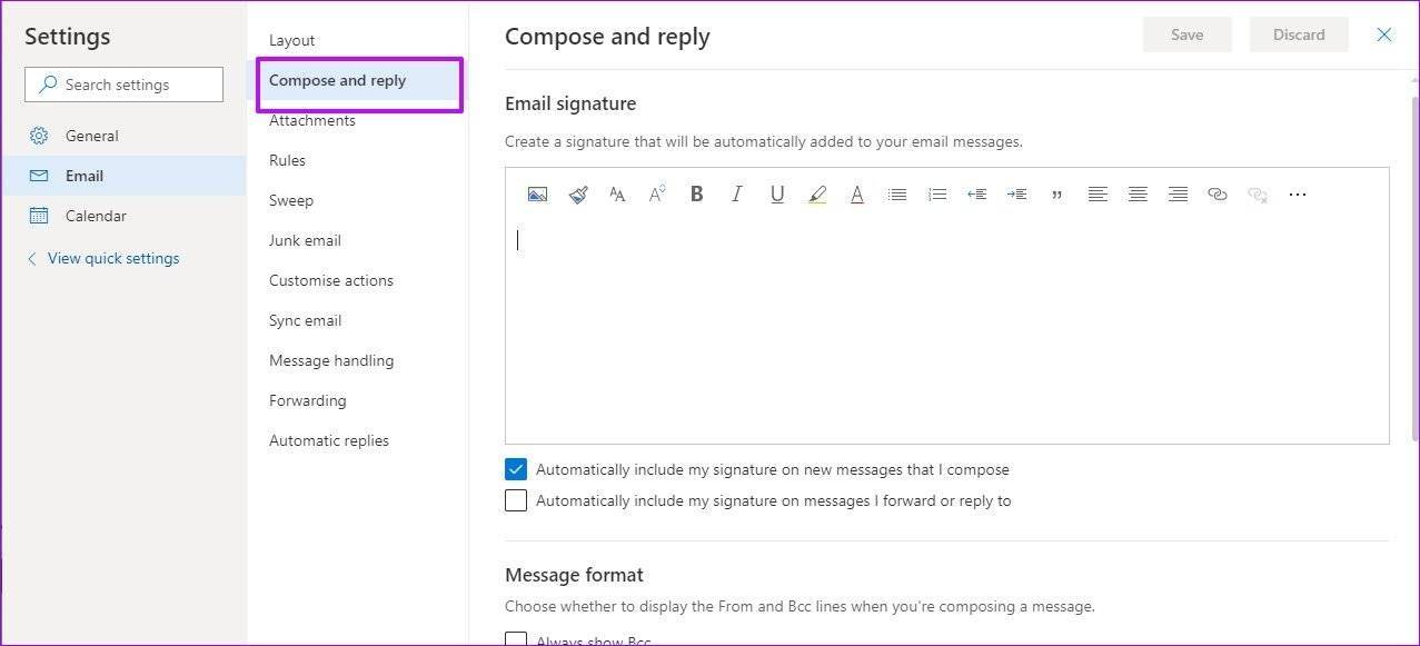 Шаг 2: Выберите «Почта» и нажмите «Составить и ответить». К счастью, первый вариант, который открывается, это Подпись.