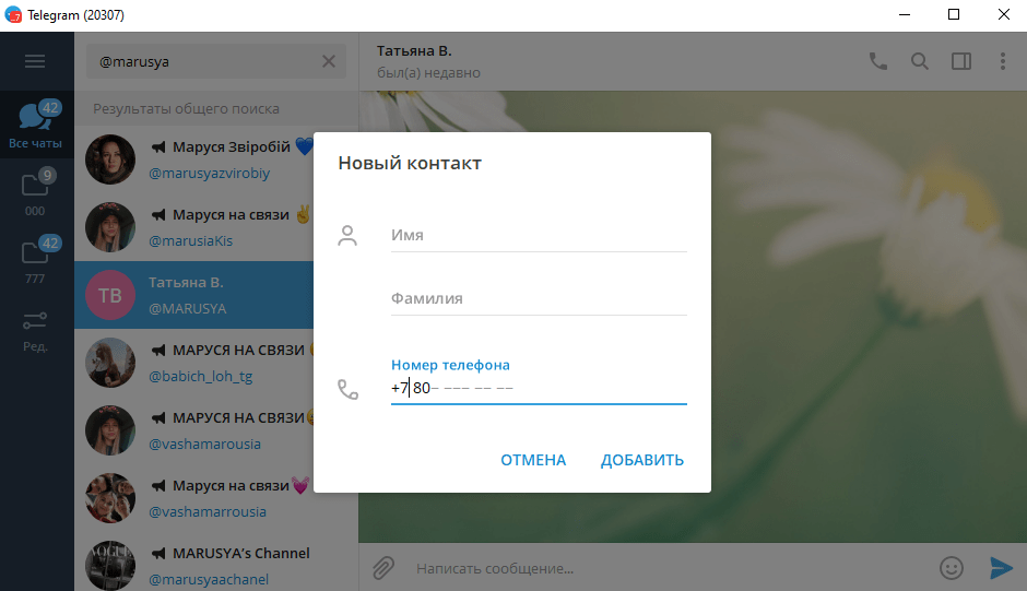 - Добавление контакта вручную по номеру. Необходимо создать его в самом Telegram или на смартфоне.