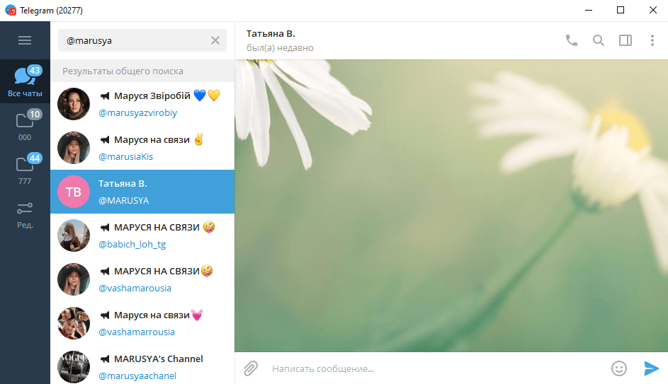 Обратите внимание, в нашем примере мы искали ник “@marina_mousse”, но Телеграм нашел достаточно много вариантов, и наш искомый далеко не на первом месте.