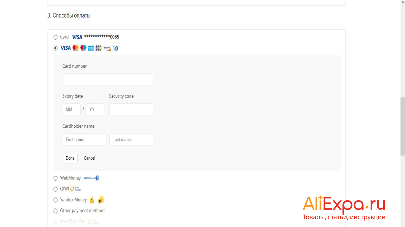 После этого вы сможете заполнить столбцы данными вашей карты. Если вы ранее совершали покупки на Али, то в поле «платежный адрес» будет указано ваше