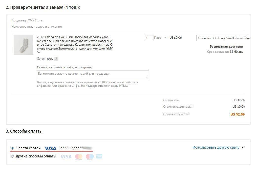 К примеру, выберите любой товар, отправьте его в корзину и нажмите «Оплатить». В третьем пункте оформления заказа «Оплата» вы увидите возможность выбора другого способа оплаты либо возможность использования новой банковской карты. В нашем случае кликаем «использовать другую карту».