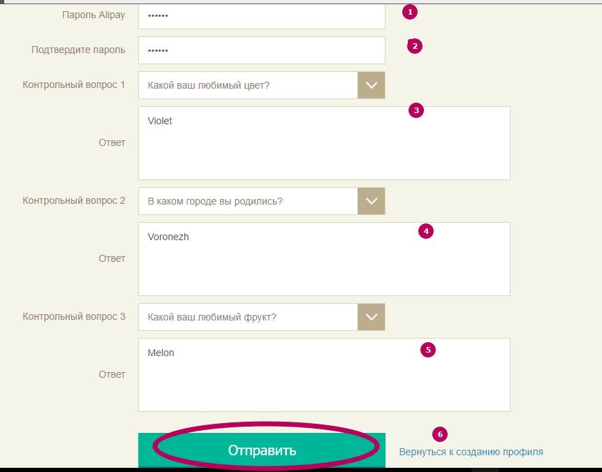 Далее переходим по полученной ссылке в письме на сайт intl.alipay.com. Где потребуется придумать пароль из 6 цифр и ввести в соответствующие поля ввода, а также подобрать 3 контрольных вопроса для возможного восстановления аккаунта при потере пароля. После нужно нажать кнопку Отправить.