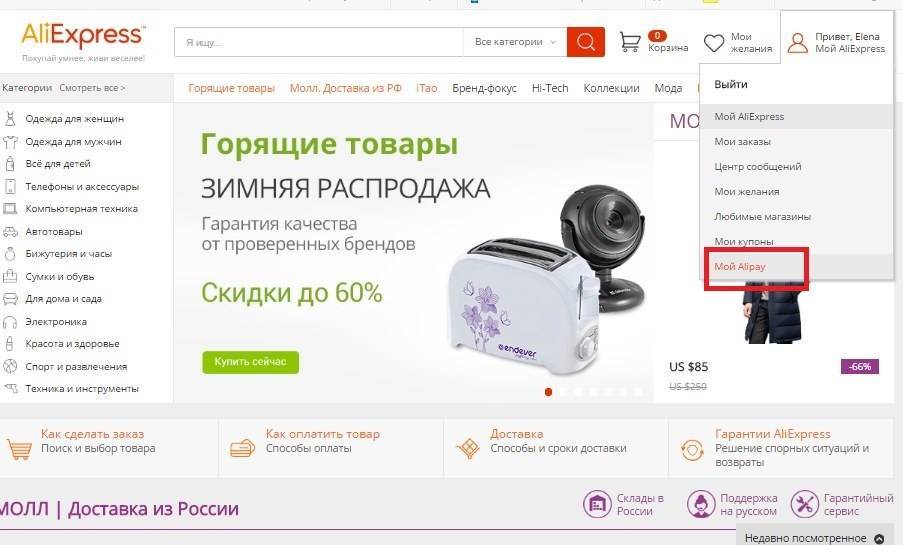Чтобы отключить эту удобную на первый взгляд услугу и отвязать действующую банковскую карту от aliexpress нужно для начала войти на сайт под своим именем. Когда пользователь зашел в свой аккаунт на aliexpress, ему нужно открыть в меню вкладку «Мой Alipay». Чтобы долго не искать данный раздел, мы покажем, где расположена данная вкладка на сайте (фото 1). Фото 1