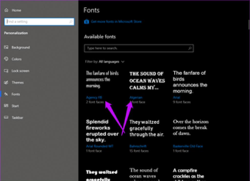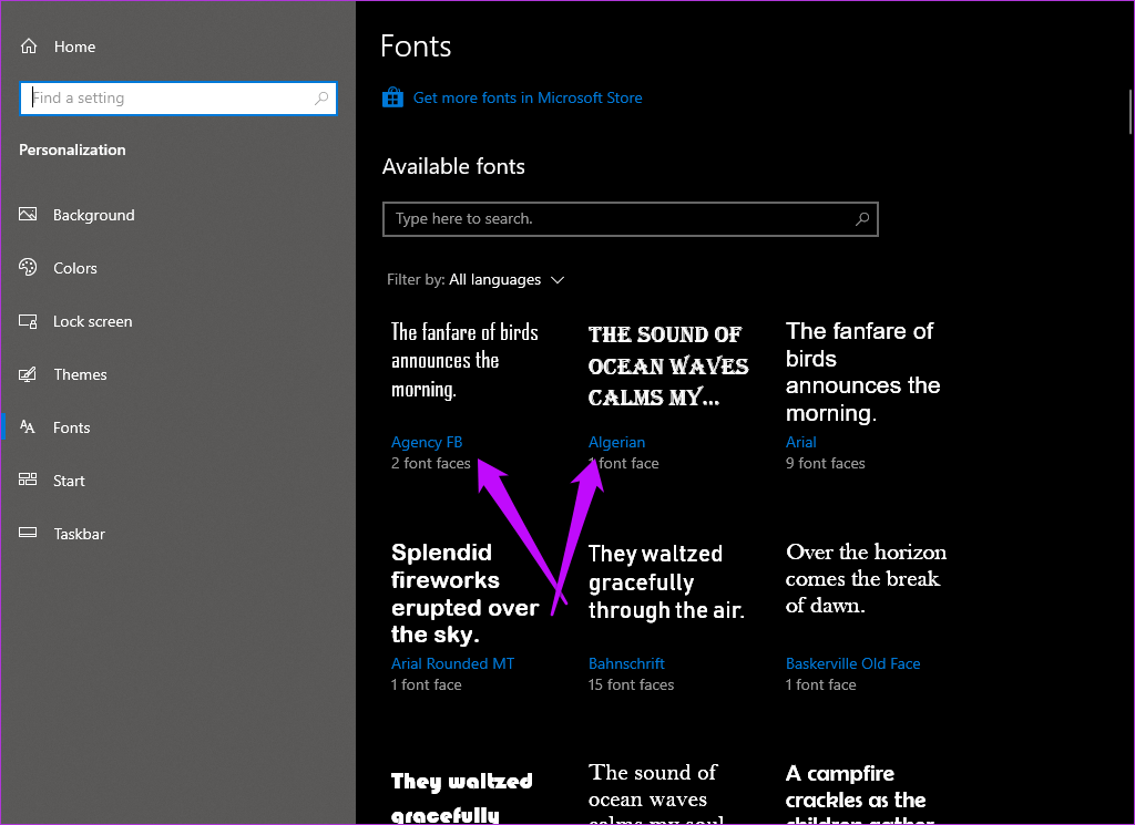 На левой панели выберите «Шрифты», чтобы отобразить все установленные шрифты на правой панели. Здесь вы можете прокручивать список вниз, искать или фильтровать список по языкам.
