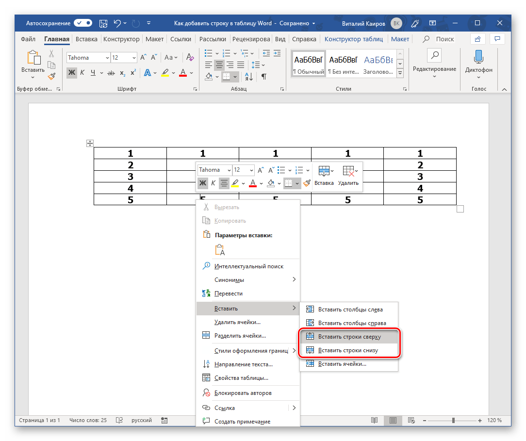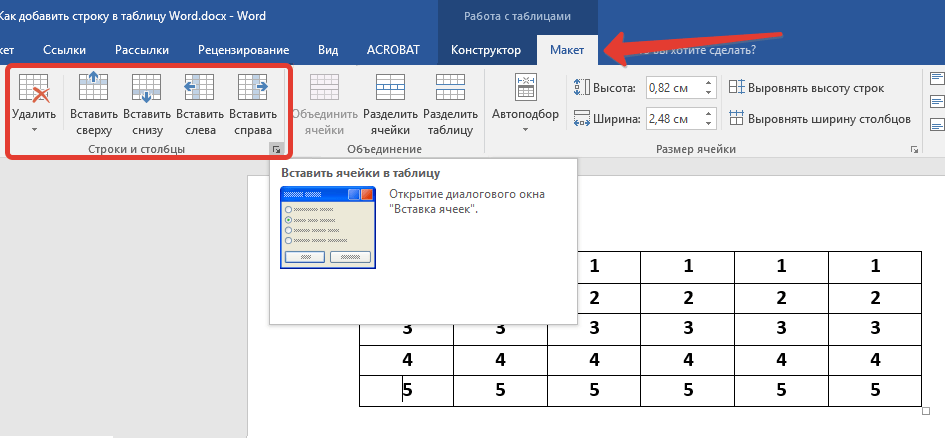 Как вставить строку/ столбец в Ворде в таблице (5+2)