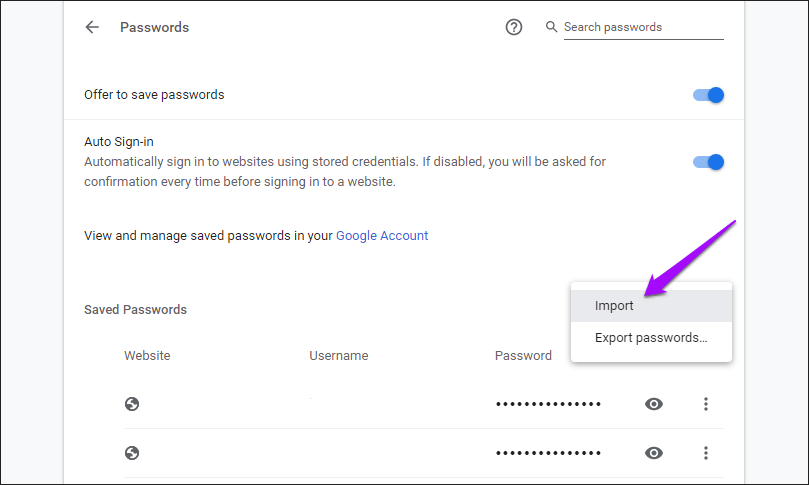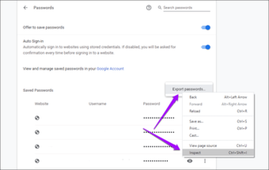 Шаг 1: Перейдите в Настройки Chrome> Пароли, а затем щелкните значок с тремя точками рядом с Сохраненными паролями. Затем щелкните правой кнопкой мыши «Экспорт паролей» и выберите «Проверить».