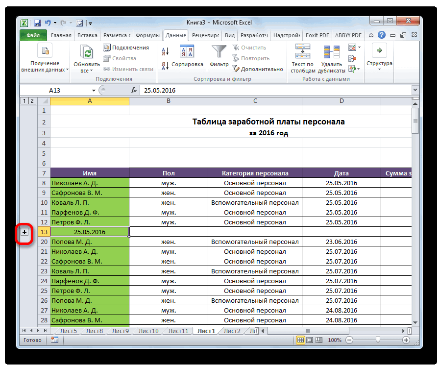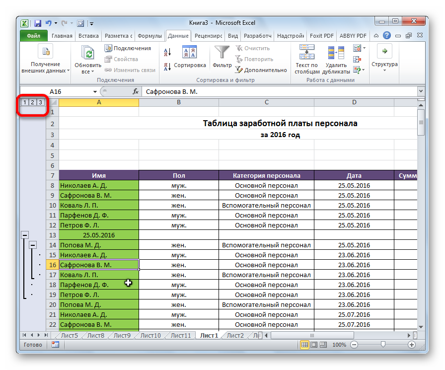 Если нужно скрыть группу, то нужно сбоку нажать на минус, а если развернуть — на плюс. Кроме того, Excel отображает число уровней группировки — в нашем примере их 2.