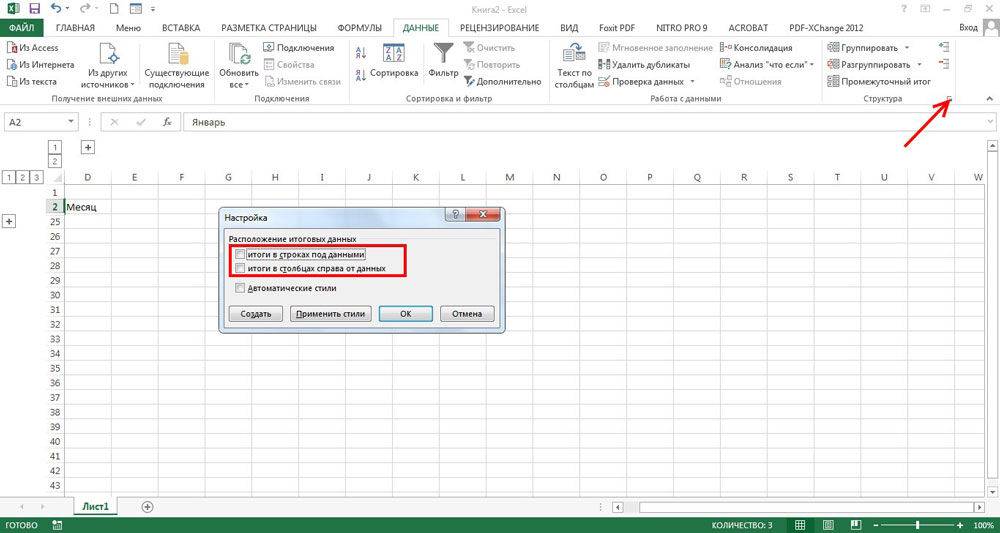 На экране отобразится небольшое окошко с параметрами функции. Здесь мы можем настроить отображение итогов. Ставим галочки напротив нужных опций (в т.ч. автоматические стили) и жмем кнопку OK.