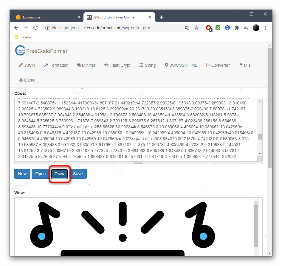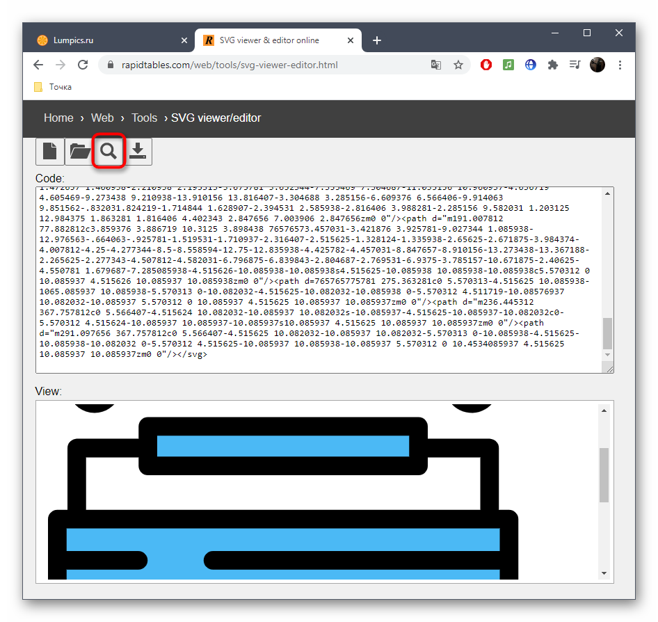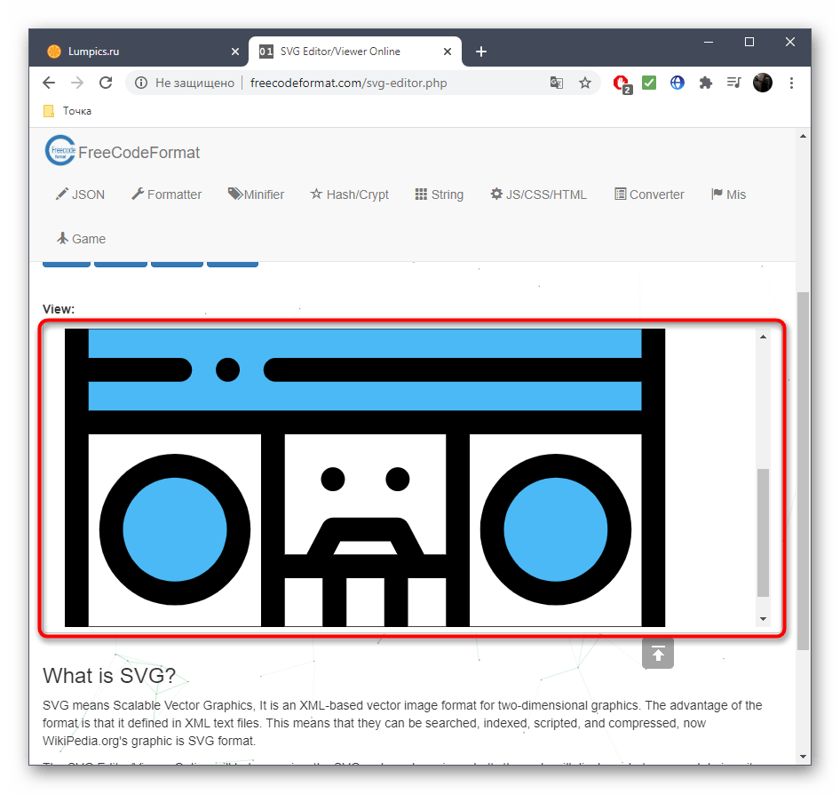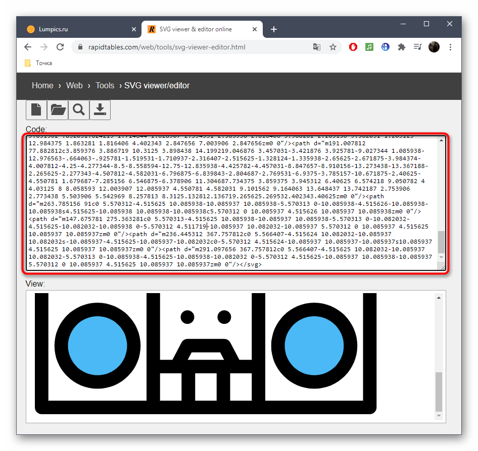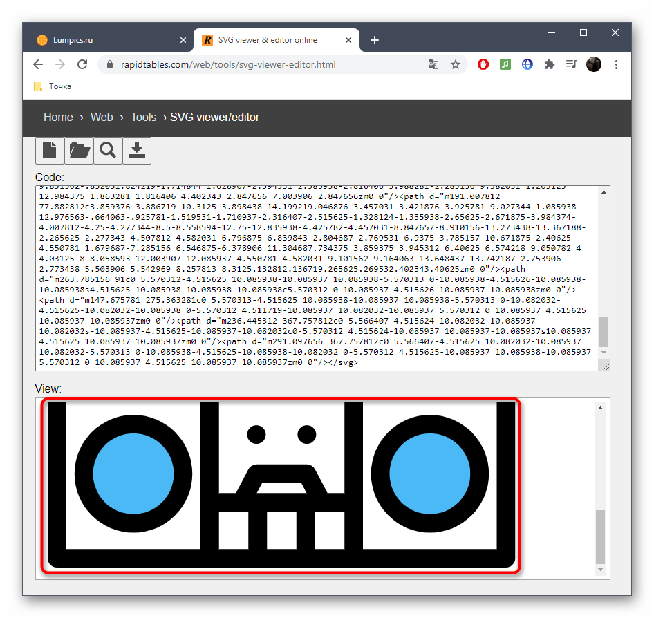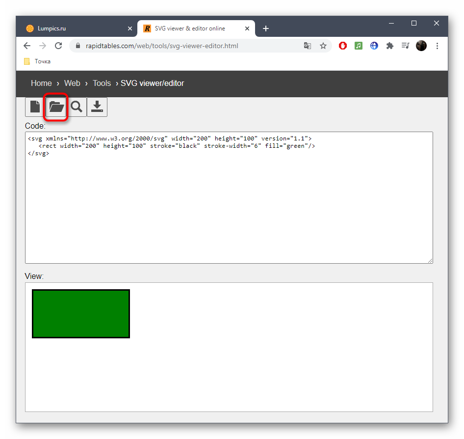 Онлайн-сервис RapidTables поддерживает не только открытие изображений, хранящихся в формате SVG, но и позволяет редактировать их в режиме реального времени, чтобы потом сохранить на своем компьютере. Просмотр и последующее изменение содержимого происходят следующим образом: