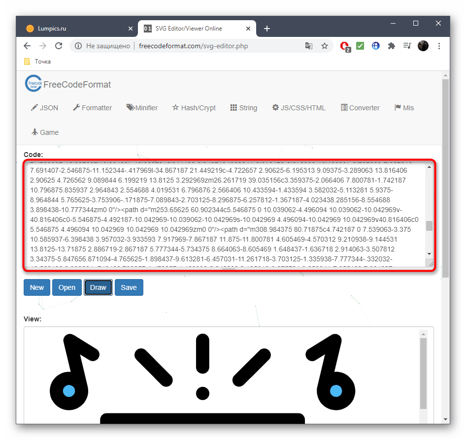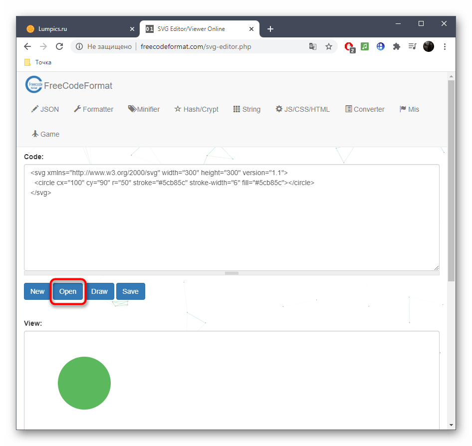 - Оказавшись на главной странице FreeCodeFormat, сразу же нажмите «Open», чтобы перейти к добавлению SVG-изображения.
