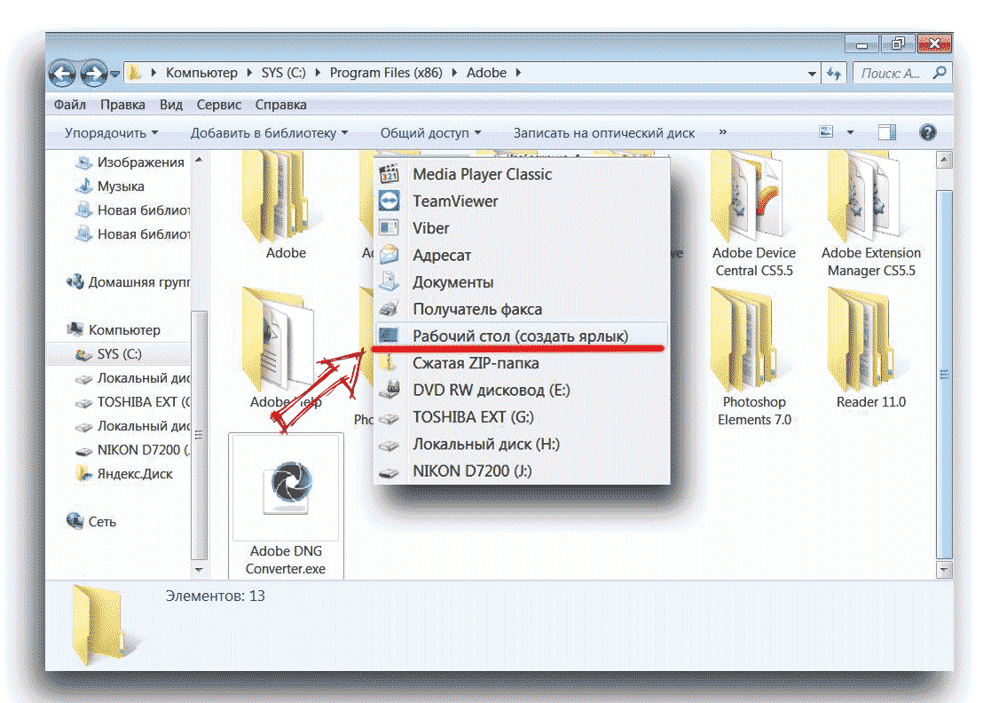 Щелкаем правой кнопкой мыши по файлу Adobe DNG Converter.exe и в контекстном меню выбираем «Отправить на рабочий стол(создать ярлык)».