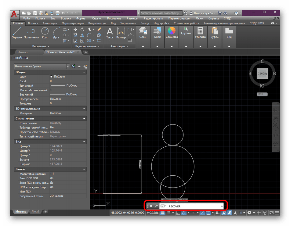 Снова воспользуйтесь командной строкой, где введите _RECOVER .