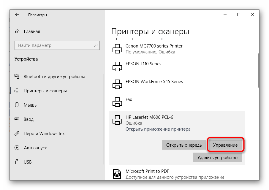 Щелкните по кнопке «Управление», чтобы перейти к настройкам печатного оборудования.